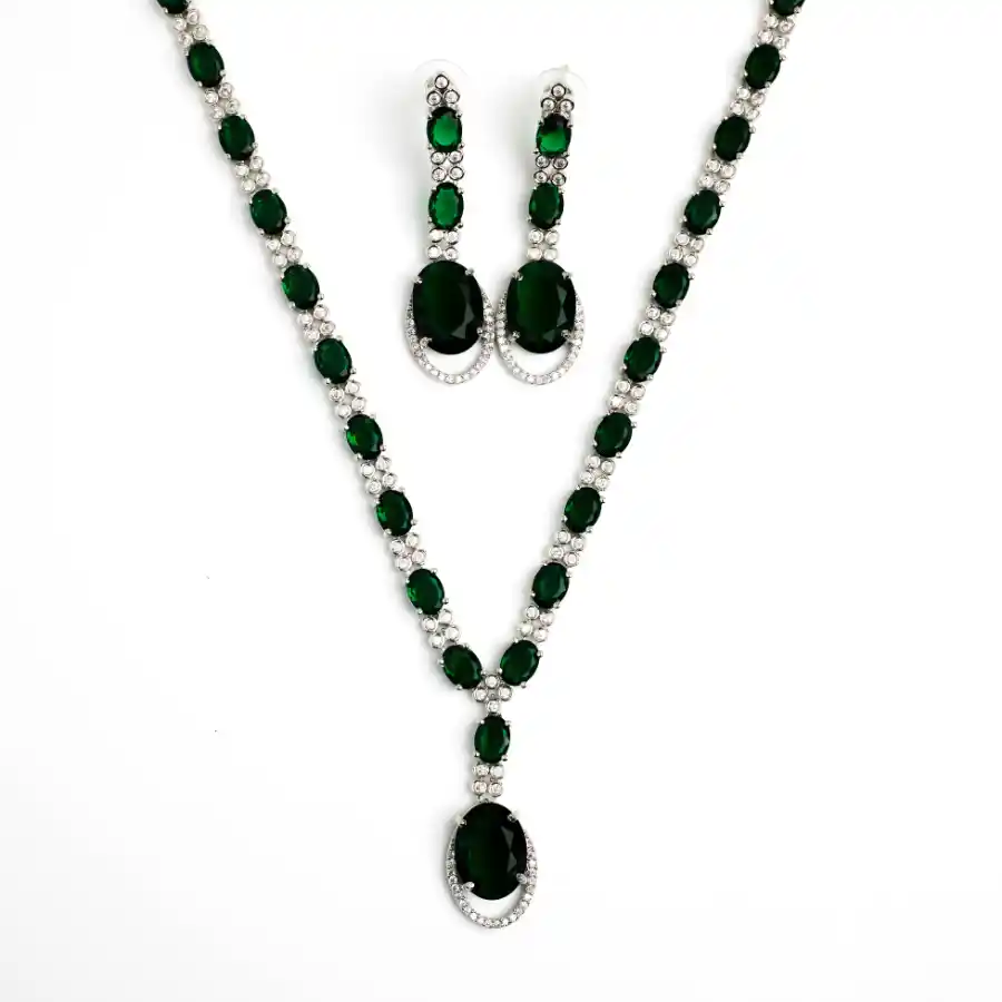 the perfection of women shaped into a necklace with shining and eye-catching oval shaped stone within a semi-surrounding line of small round shaped Cubic Zirconia stones. The body of the set and earrings are studded with alternative dazzling emerald green oval shaped and a set of white 4 small round Cubic Zirconia stones. The perfect set for an elegant sarree, parties, festivals and anniversaries.